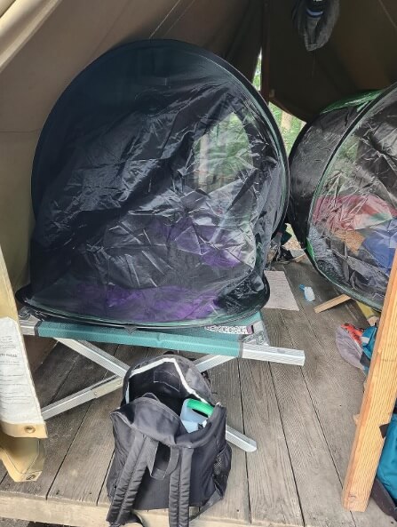 Some folks don’t like the fact that the SansBug hangs over a cot. The SansBug one person tents have to be bigger than a cot to prevent you from touching the netting and being bit! An average adult changes position about every 20 minutes when sleeping. That number will go up with discomfort, unfamiliar surroundings, and anxiety… which is expected at summer camp, especially for a first-time camper. When you change position, your limbs are bound to touch the netting if it is too close. A camping tent that fits perfectly on a cot will force you to either sleep in only one position, or wake up with some nasty bites!
